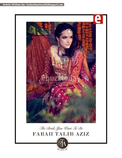 Viewers as you now that these days running wedding season(marriage trend) in Pakistan as well as India. Just a while now FARAH TALIB AZIZ has introduced its newest Spring Summer 2015 Customized Couture Collection for women. Farah Talib Aziz is known as Karachi’s extremely popular fashion label. The slogan of this catalog is “The Bride You Want To Be”. This fashion brand has introduced traditional and contemporary dresses for contemporary brides. We are sure that the brides feel extraordinary and exceptional on her wedding day after wearing it. The dresses have been nourished with and ideal work of embroidery and fancy work. The fashion designer has highlighted the tradition plus culture in this bridal ensemble range that a young bride expects. These dresses really make every bride more special, unique and beautiful. Graceful ensembles help to make your wedding occasion more implausible and unforgettable. These bridal attires made with silk, chikankari and French net. All these rich and royal bridal suits adorned with silk thread embroidery, gold, silver and eye-catching zardozi work. Banarsi finishing has given an extra sheer look to this bridal range. Here you can find out lehengas, ghararas, paneled peshwas, angrakha suits, layered long shirts, sheer enhanced cholis and superb jackets.